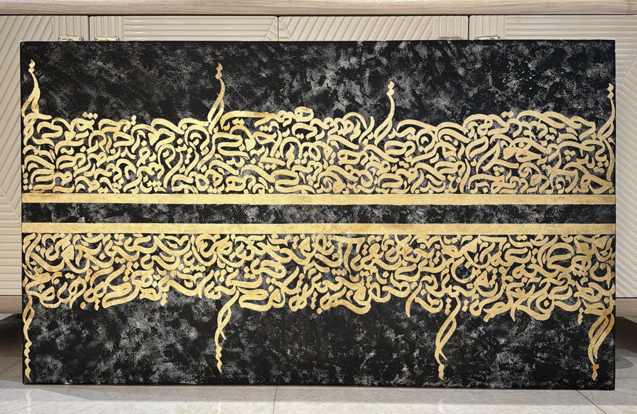 سایز : ۱۲۰ در ۷۰ سبک : کالیگرافی و پتینه  متریال: رنگ اکرلیک و ورق طلا