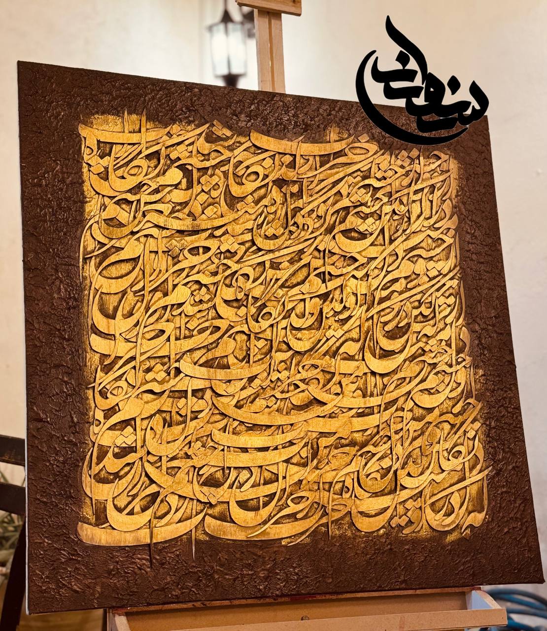 سایز کار : ۸۰ در ۸۰ سبک کار: کالیگرافی برجسته متریال: تکسچر و چوب و رنگ اکرلیک