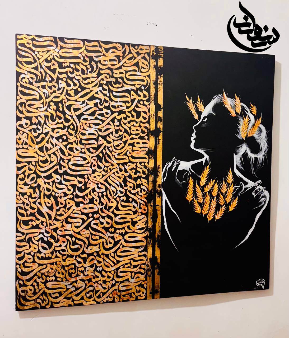 سایز کار: ۱ متر در ۱ مترسبک کار : نقاشی فیگور و کالیگرافی متریال:رنگ اکرلیک و ورق طلا و ورق نقره و ورق مس
